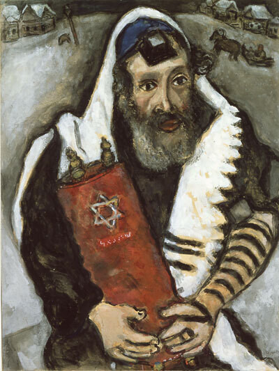 Rabbi met wetsrol (Marc Chagall – 1887 – 1985) ‘In dit schilderij stelt Chagall in sobere kleuren en lijnen een religieuze jood centraal. Gehuld in een gebedsmantel, de gebedsriemen om het voorhoofd en de arm gebonden, houdt de man een Torarol in zijn handen.’ © Marc Chagall, c/o Pictoright Amsterdam/Chagall ®, Chagall is a registered trademark, owned by Comité Marc Chagall/Stedelijk Museum Amsterdam